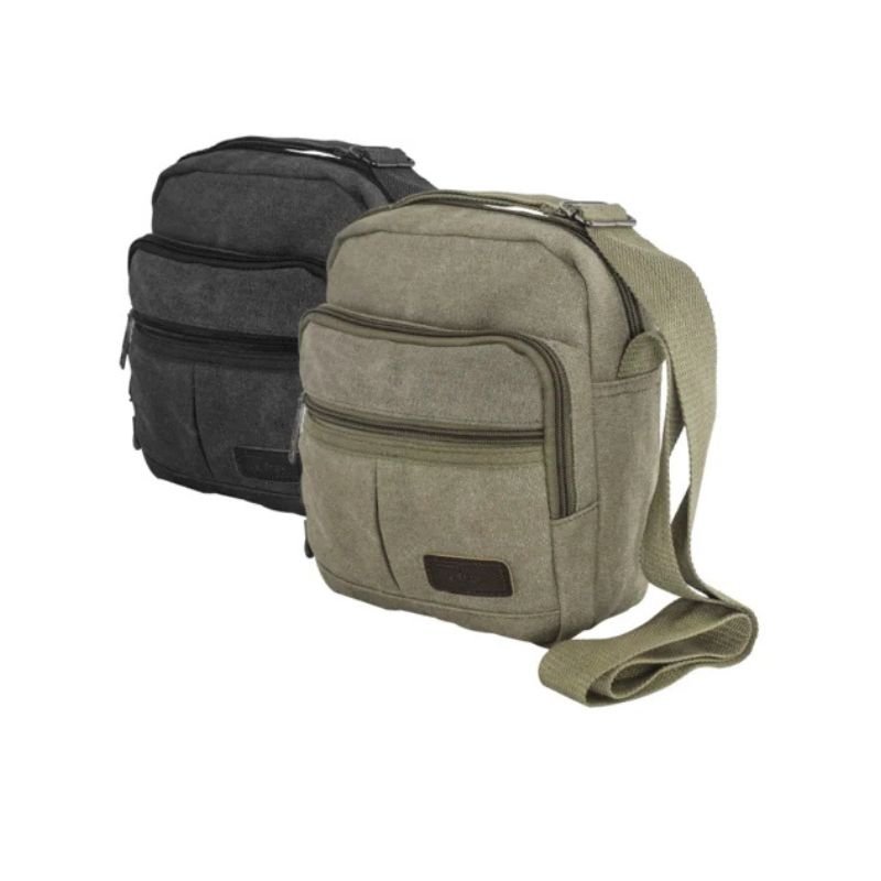 En tela CANVAS. Una división grande, dos bolsillos frontales, bolsillo trasero escondido. Colores verde y negro. Medidas 24x20x10 cm