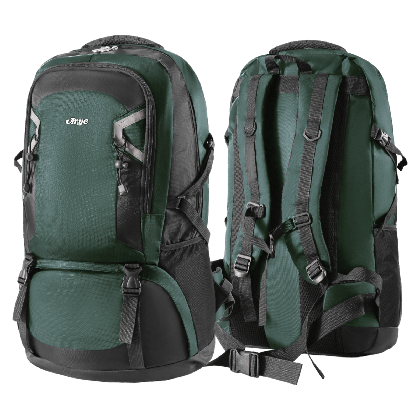 Dos bolsillos delanteros con cierre. Dos bolsillos laterales grandes. Regulación de profundidad lateral con hebillas. Bolsillo grande con cierre en la tapa de la mochila. Presilla sujetadora superior. Ajuste de cintura acolchonado. Colores: verde y negro. Medida aproximada 60x32x30cm.