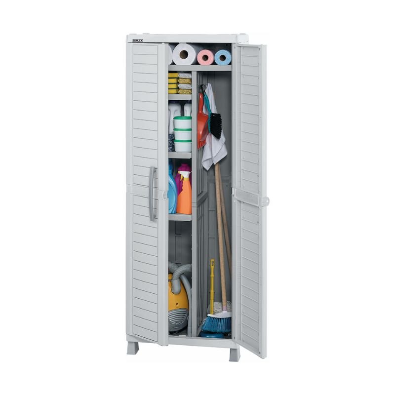 Armario Multiusos, con 3 entrepaños ajustables que resisten hasta 25 Kg cada uno y división central que permite almacenar de la mejor forma los elementos de aseo del hogar . Fácil de armar, mover y limpiar. Con la resistencia y beneficios del plástico. Excelente capacidad interior, con orificio para uso de candado para mayor seguridad. De apariencia moderna y elegante. Ideal para interiores y exteriores. Beneficios Manijas verticales. Mejor agarre y diseño. 3 Entrepaños regulables. Resiste hasta 25 kg por entrepaño. Fácil de mover. Fácil de armar