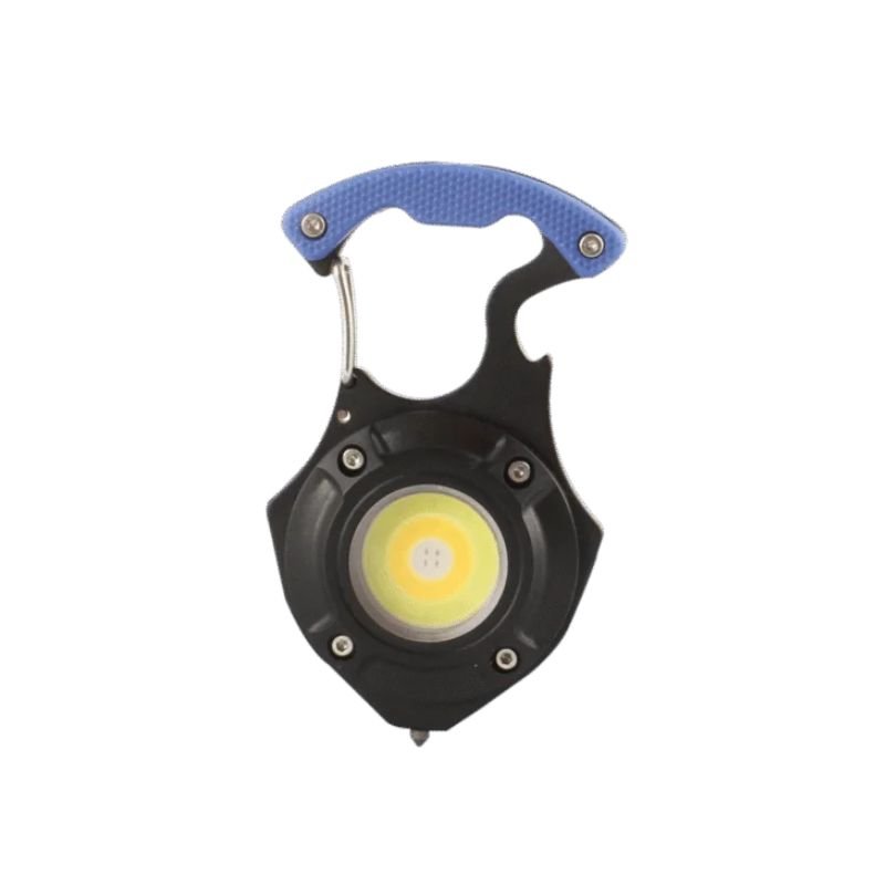 Se puede usar en el cinturón, tiene imán. Carga USB. Indicador de nivel de carga. 6 posiciones: alta, media, baja, rojo y parpadeo rojo. Destapador de botellas.