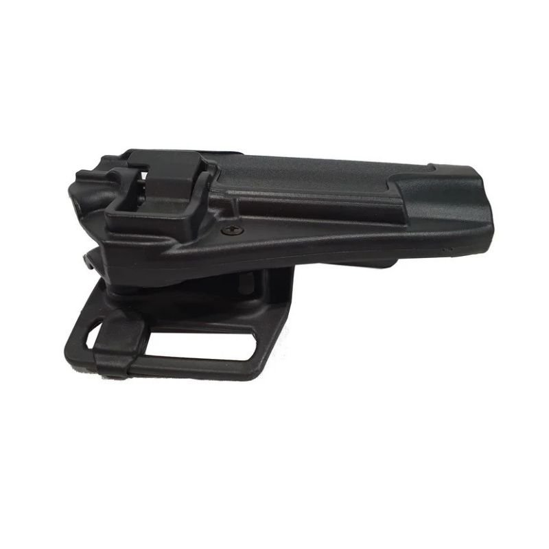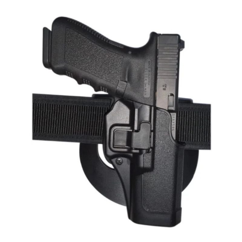 Porta pistola Glock para pierna derecha. Color negro. Se puede poner en cinturón y correaje.