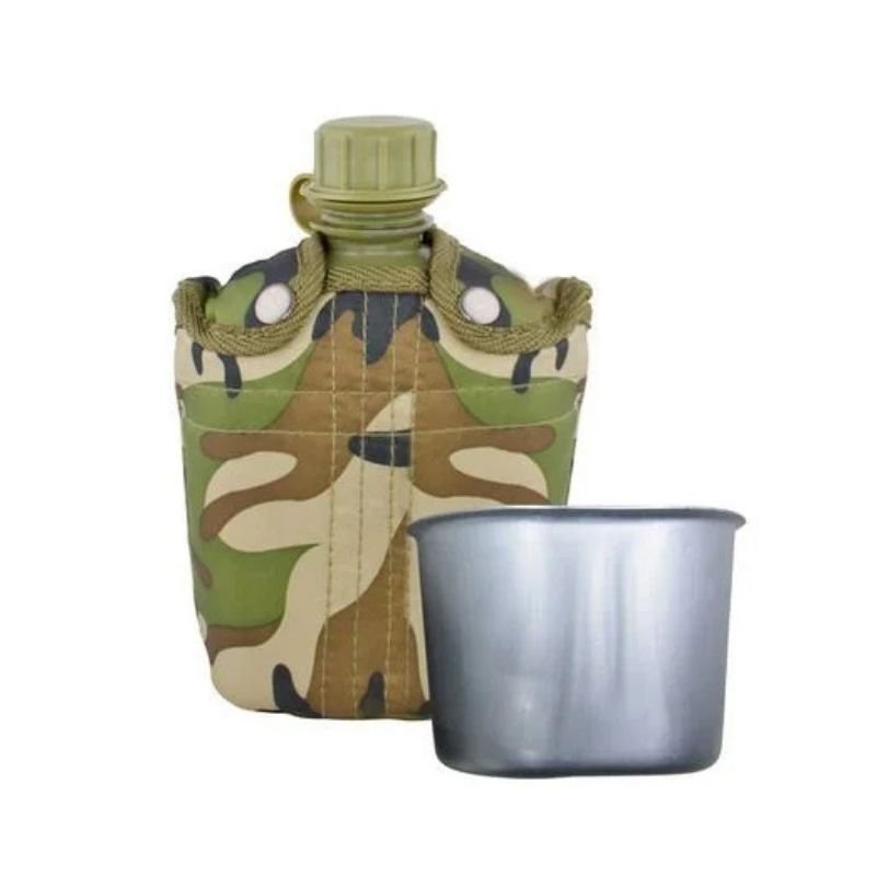 Capacidad 1 Lt. aprox. incluye latón y estuche en poliéster camuflado. Con enganche para cinturón.