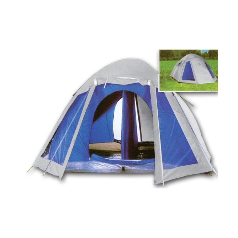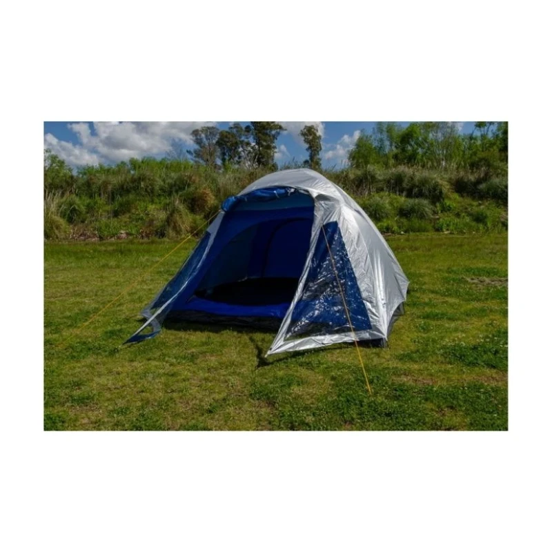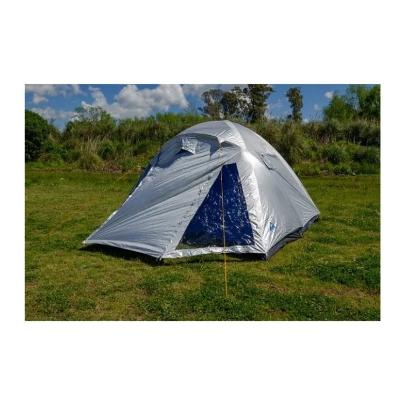 Sobretecho nylon taffeta 190T aluminizado, mosquitero, estructura de fibra de vidrio de 2x11mm y 1×9,5mm, piso lona cubretodo impermeable. 800mm columna de agua. Doble puerta. Seam tape: costuras termoselladas a prueba de agua.