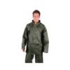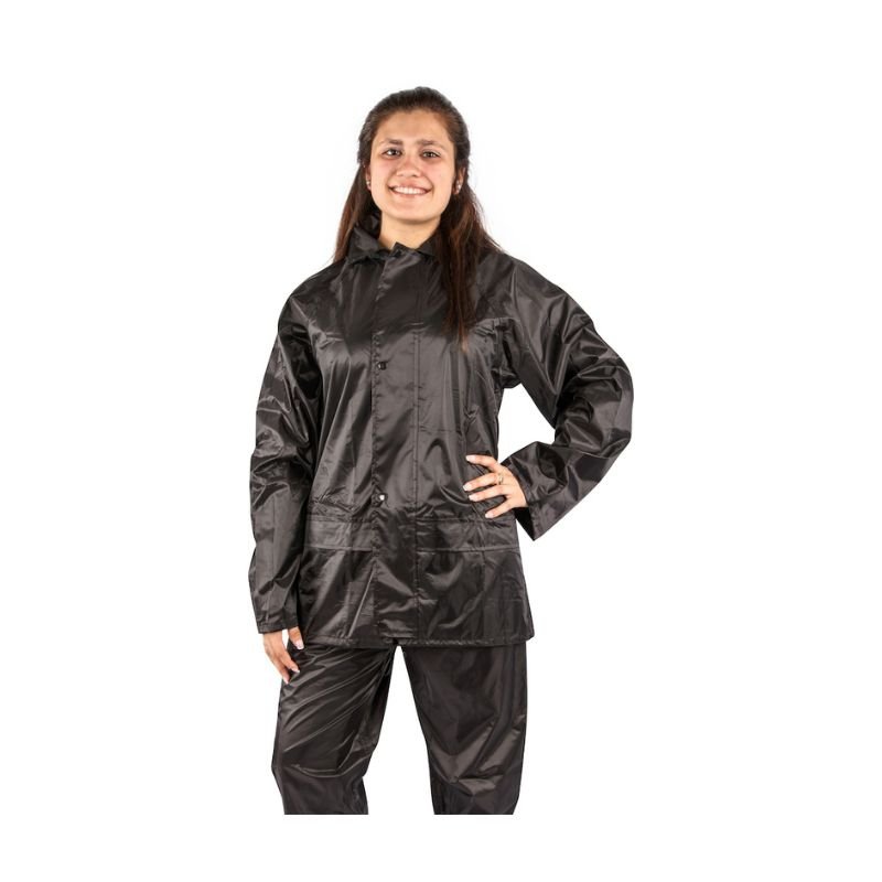 Campera con cierre diente de perro plástico largo con carterón. Manga raglán con doble costura de seguridad, dos bolsillos. Broches de presión en puños de mangas para su mayor ajuste. Capucha incorporada con cordón, se guarda escondida en el cuello con cierre. Respiración interior. Todas las costuras termoselladas como en las carpas, para garantizar la impermeabilidad. Pantalón: con abertura de acceso directo al bolsillo, reforzado en la entrepierna y con broches de ajuste en los bajos. Talles del S al XXXL, colores amarillo y negro. Sobre de la misma tela con cierre