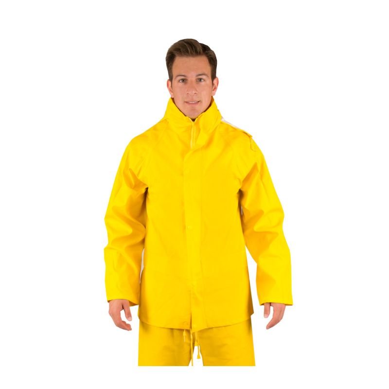 Campera 3/4: Con cierre plástico largo. Carterón con broches plásticos de presión. Manga raglán con doble costura electrónica de seguridad, dos bolsillos plaqué soldados, con protección en las esquinas con tachas de plástico. Capucha incorporada con cordón. Pantalón: sin bolsillos ni aberturas, reforzado en la entrepierna y con broches de ajuste en los bajos. Talles del S al XXXL, colores verde, amarillo y azul. Tela: PVC/POLIURETANO, muy flexible y liviano.