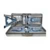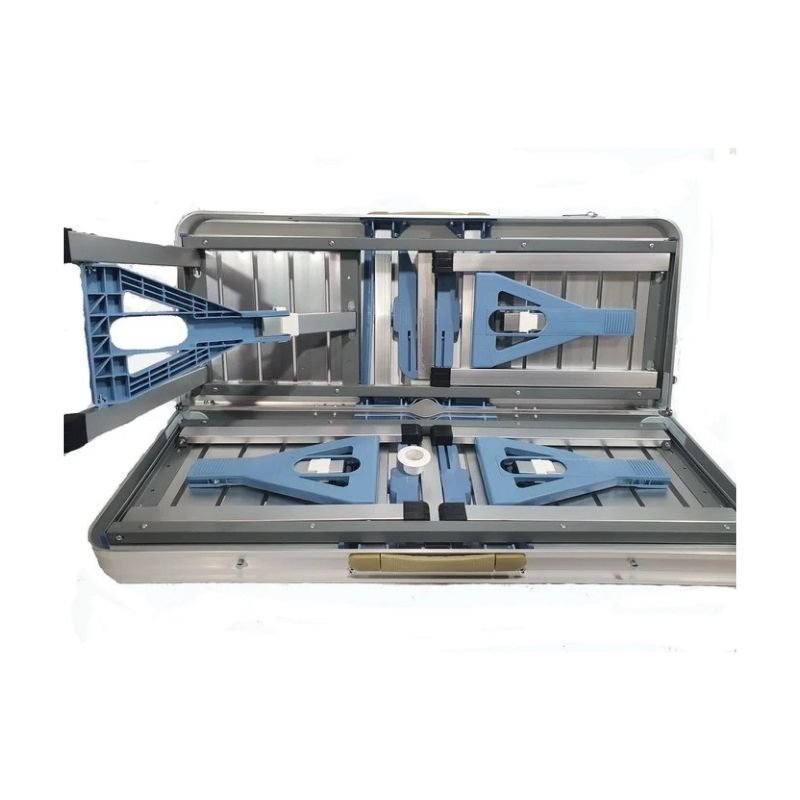 De 85X65 cm. Aprox. para 4 personas con bancos incluidos. Se cierra como valija para fácil transporte. Material: aluminio. Peso con caja 8.9 kg.