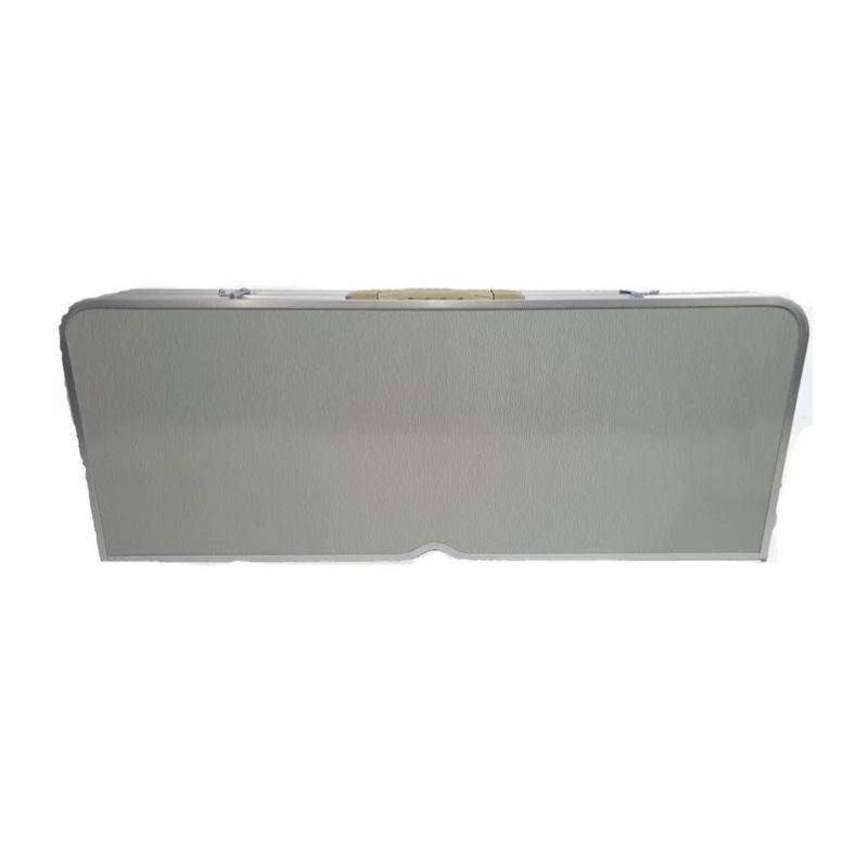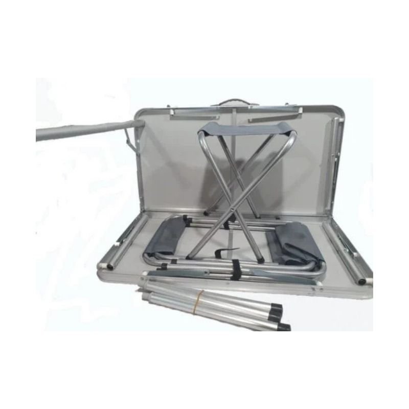 De 85X80X70 cm. Incluye 4 banquitos plegables. Se cierra como valija para fácil transporte. Peso con caja 7.9kg