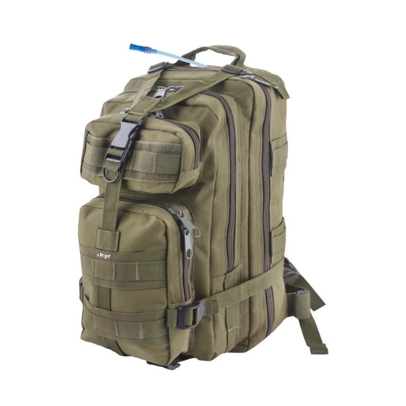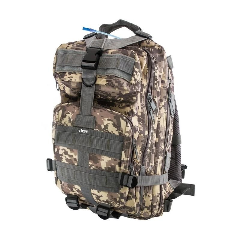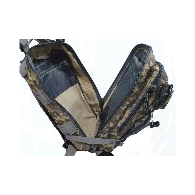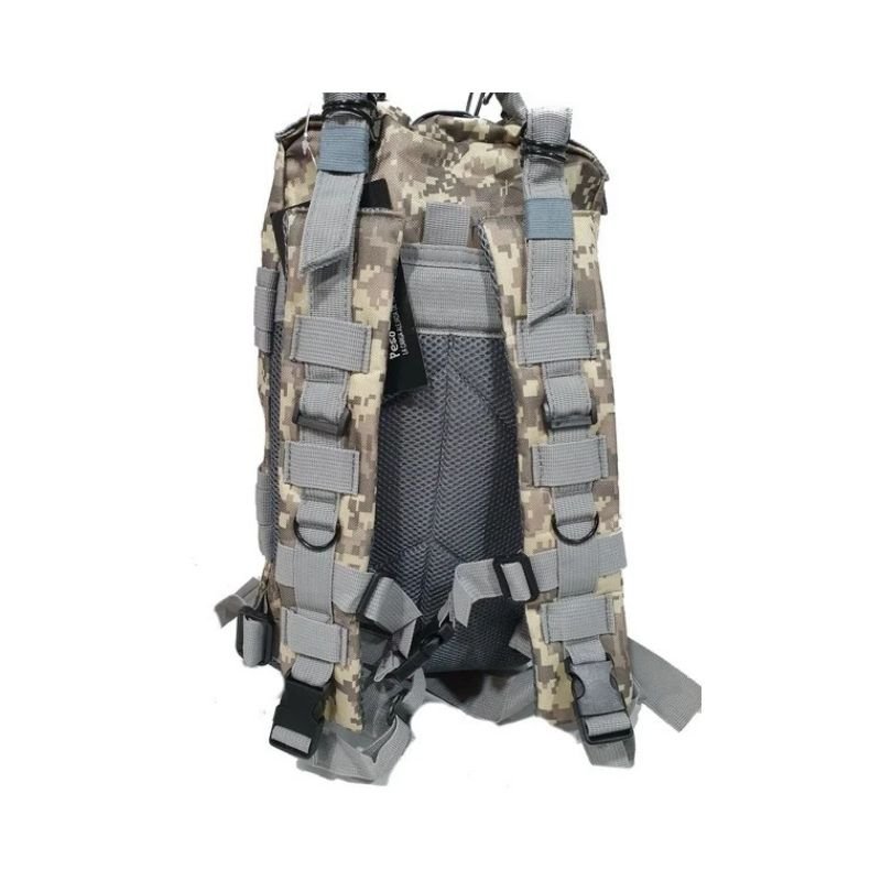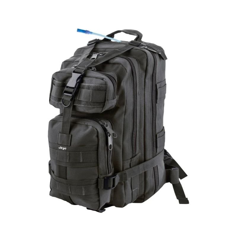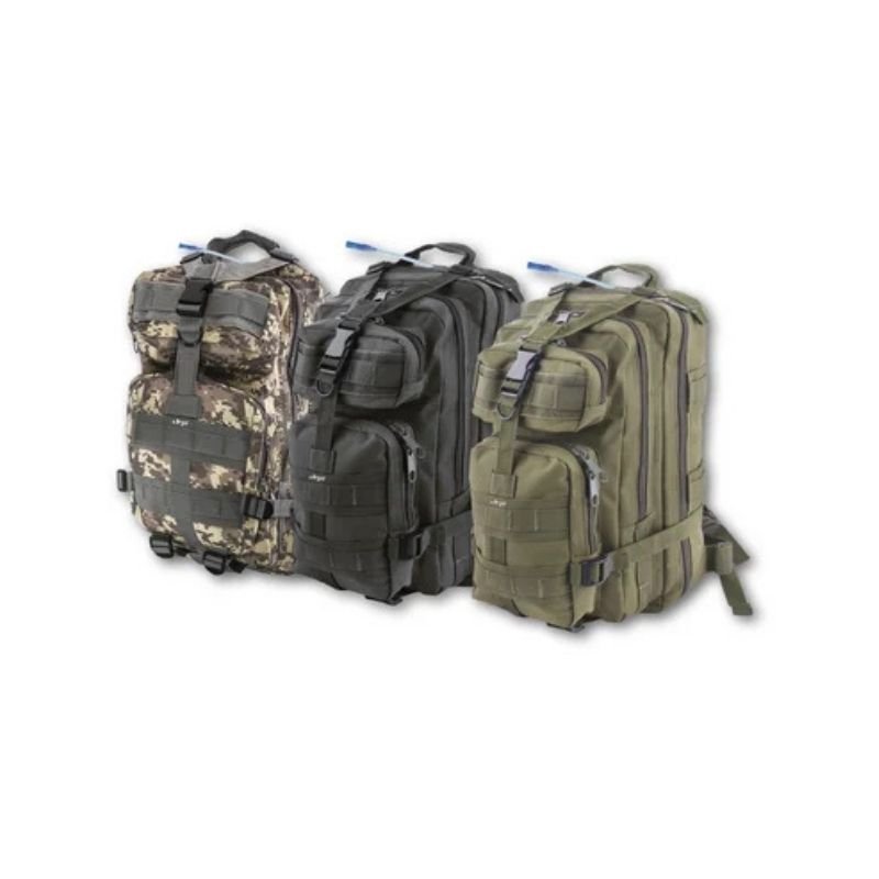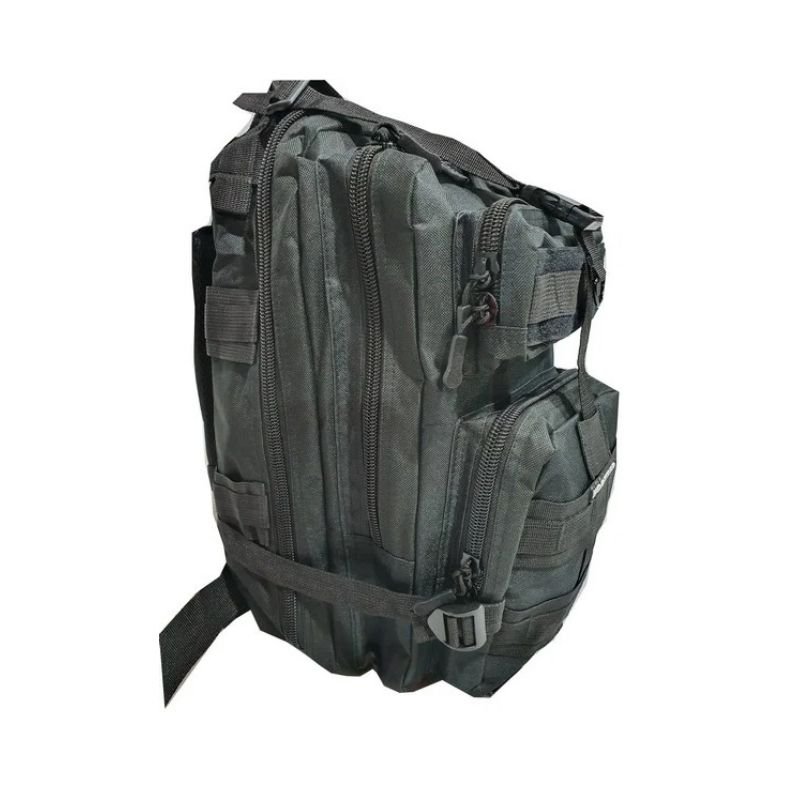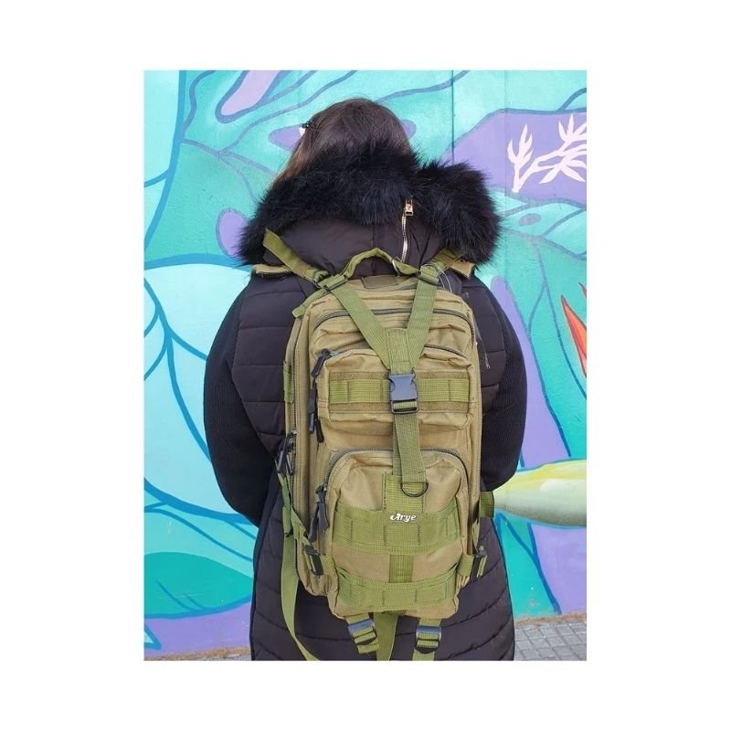 En NYLON OXFORD 800D. Dos bolsillos frontales con cierre, uno con portalápices y portaobjetos. Una repartición intermedia con organizador interior y portaobjetos de red. Parte principal con un bolsillo grande de red y un bolsillo portadocumentos con cierre. Salida para cánula de hidratación. Múltiples puntos de sujeción MOLLE laterales, superiores, inferiores y frontales. Protección reforzada en la espalda con bolsillo grande con velcro. Regulación de profundidad lateral con hebillas. Correa ajustable con portaobjetos. Ajuste de altura de las correas traseras. Manija superior reforzada. Espalda muy acolchada estilo PORTTER+. Con ajuste de cintura y pecho.