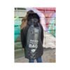 En PVC. Se puede usar como mochila o bolso. Tiene manija para fácil transporte. A prueba de agua.