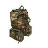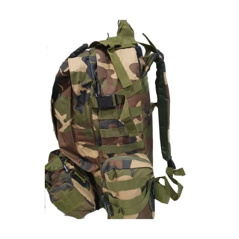 En NYLON OXFORD 800D Camuflada. Mochila militar táctica de entrenamiento. Riñonera-bolso militar extraíble de gran capacidad con 2 bolsillos laterales con cierre y 2 presillas portaobjetos. Bolsillo frontal con organizador. Múltiples puntos de sujeción MOLLE. Mochila: 2 bolsillos laterales extraíbles con portaobjetos MOLLE. Doble regulación de profundidad lateral con hebillas. Sujetadores laterales. Bolsillo grande con organizador de red. Portanotebook y Porta bolsa de hidratación con salida para la cánula con velcro. Múltiples puntos de sujeción MOLLE frontales. Manija superior reforzada y reguladores de profundidad superior. Ajuste de altura de las correas traseras. Con ajuste de cintura y pecho.