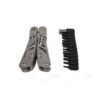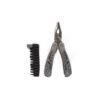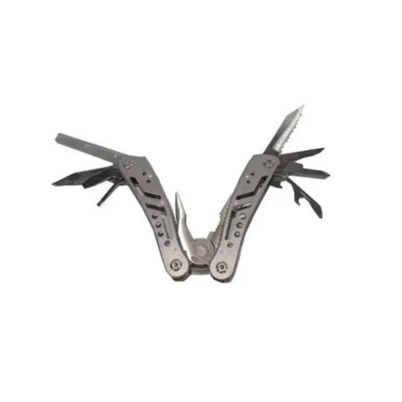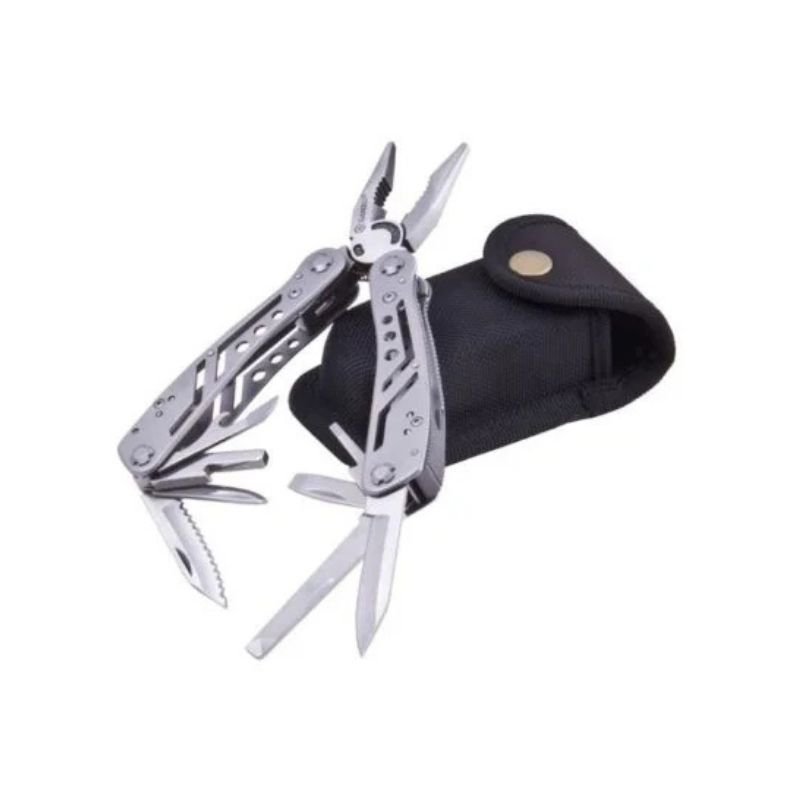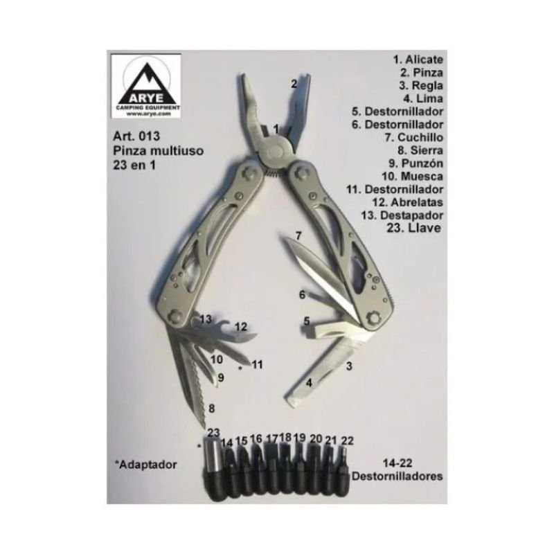 Sus funciones son sierra, punzón, muesca, abrelatas, destapador, cuchillo, destornillador x3, lima, regla, alicate, pinza, llave y además incluye 9 tipos de destornilladores que se incorporan a la pinza mediante un adaptador. Presentación en un estuche negro para cinturón, dentro de una caja. Se cierra para ocupar menos espacio.
