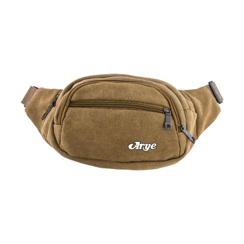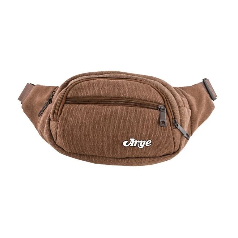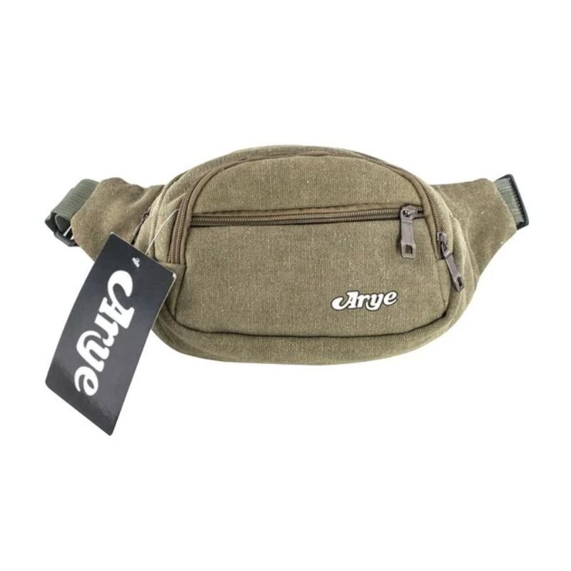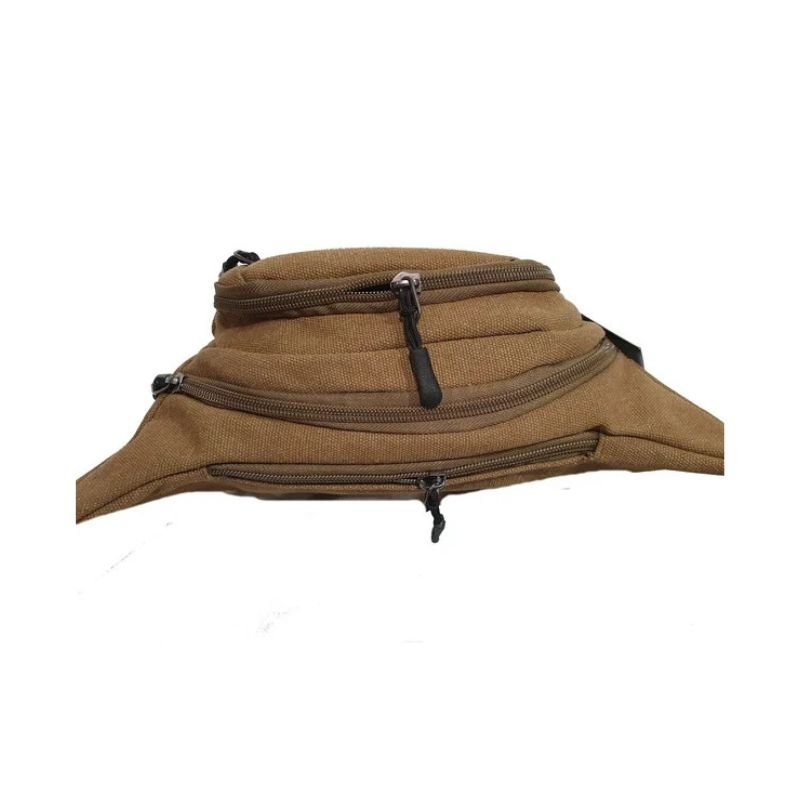 En tela CANVAS. Dos reparticiones. Un bolsillo frontal y uno trasero. Colores: marrón, beige y verde.