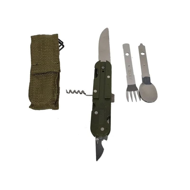 Contiene: tenedor, cuchillo con tranca, cuchara, descorchador, destapador, destornillador, abrelatas, llave, etc.